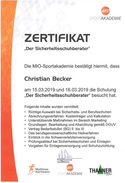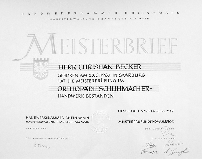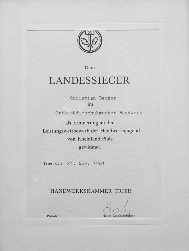Christian Becker eröffnete 1990 seinen Orthopädie‑Schuhtechnik‑Betrieb in Kusel. Bereits zuvor hatte er im Alter von nur 24 Jahren die Meisterprüfung abgelegt. Schon bei seiner Gesellenprüfung 1981 zeigte sich seine außergewöhnliche Begabung: Er wurde Landessieger im Leistungswettbewerb der Handwerksjugend Rheinland‑Pfalz.